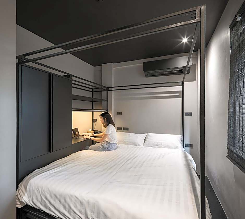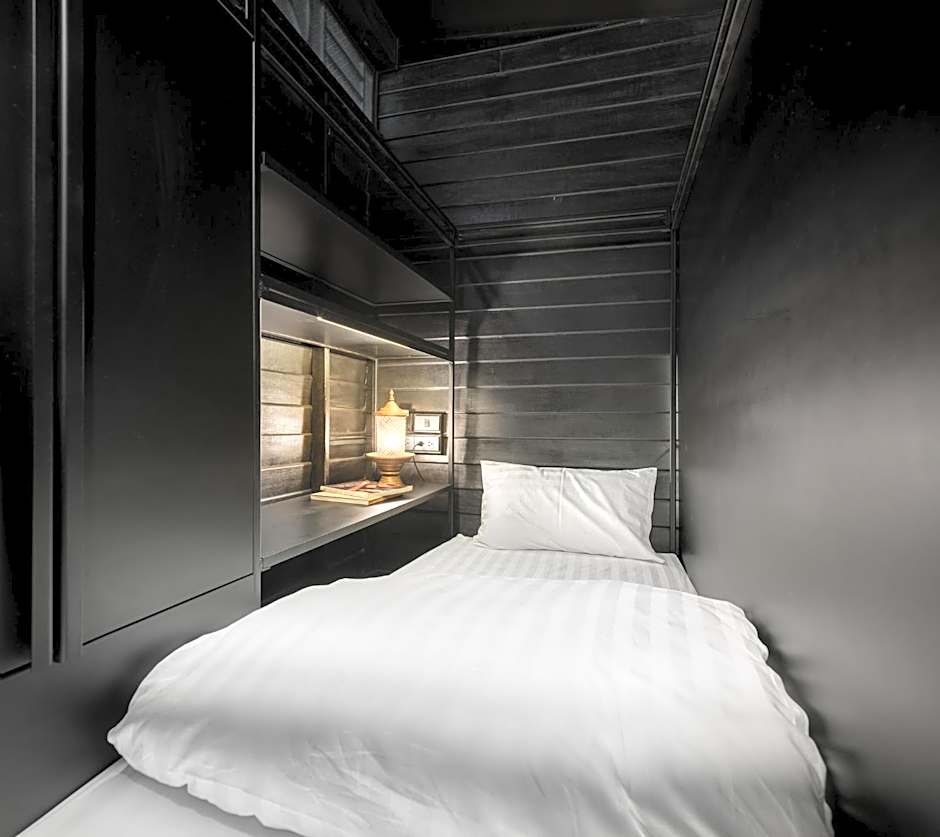 This bed in dormitory has a balcony, toaster and tumble dryer.